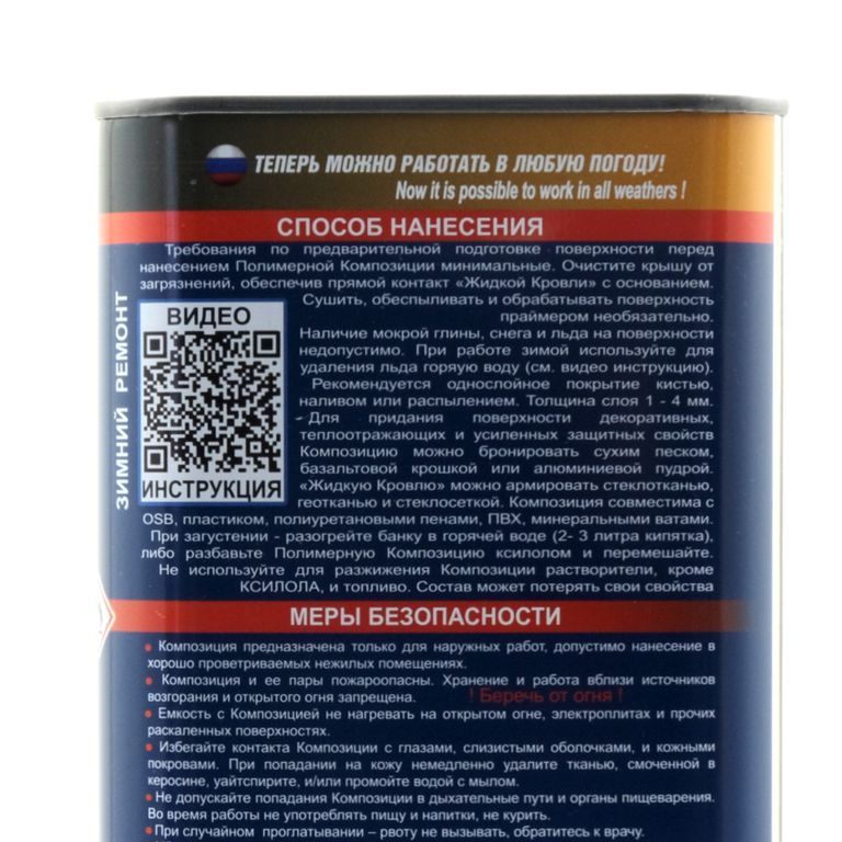 3) Пожарная безопасность. Количество горючих растворителей в рецептуре Композиции снижено в 2,5 раза по сравнению с традиционными кровельными мастиками. " Жидкая Кровля - быстрый ремонт " расфасована в многоразовую ударопрочную герметичную металлическую тару.