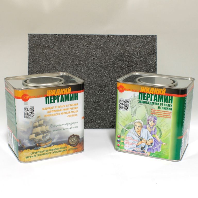 "Жидкий Пергамин" - Водовытесняющая Полимерная Композиция с эффектом тёса на основе сверхэластичного синтетического полимера. Композиция обладает как высокой капиллярной проницаемостью, так и осмотическим эффектом (мембранной проницаемостью), то есть может распространяться по капиллярам древесины, подобно сокам живого дерева.